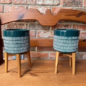 Planters in dark turquoise with wooden stands, selling as a set. Purchased at World Market. Great condition.