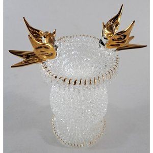 This plastic vase is in good condition and features 2 glass birds on the rim. It measures 6x5 inches.