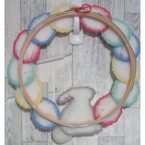The Plastic Canvas Needlepoint Wreath Easter Bunny Eggs Spring Decor is a handmade craft featuring a circular shape made from multi-color plastic canvas. This unique design serves as a perfect addition to your spring decor, adding a festive touch to your home. With its intricate pattern and vibrant colors, this Easter-themed wreath is sure to be a standout piece in your crafting collection.