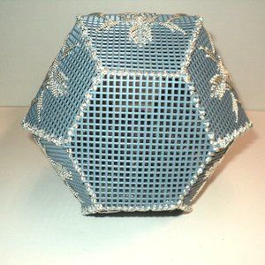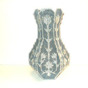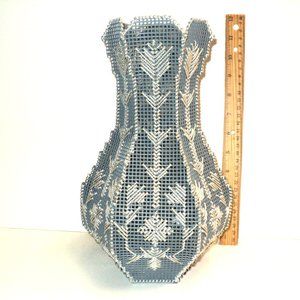 Plastic Canvas Vase Blue-Gray w/ Silver Metallic Needlepoint 11 1/2" x 7 Vintage