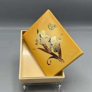 Plastic Celluloid Vanity Trinket Box Rectangle Yellow Irises Butterfly Kitschy