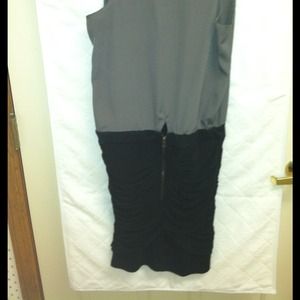 Grey satin material on top. Tight black skirt bottom with draped black mesh. Zipper in the back with keyhole detail. Cute for going out!
