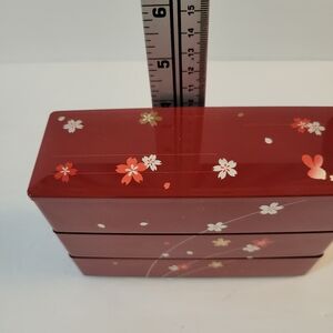 plastic burgundy and black plastic Stacking box. 3 compartments with lid. Asian Style. measures approx 6" x 4"
