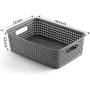 🧿PRODUCT CONFIGURATION: 8 woven pattern plastic baskets, gray. Dimensions:10.6” L x 7.2” W x 3.2” H, basket use small holes design helping ventilation, better organization and storage items.