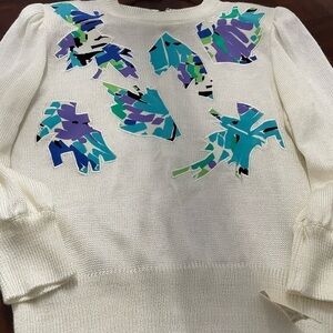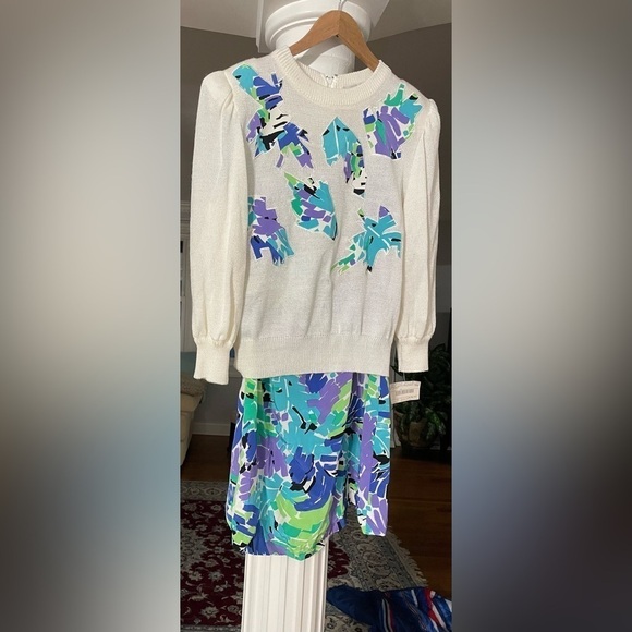 PIAT LTD.Vintage Women’s two piece sweater and skirt set . Top is white embroidered with the same fabric as the skirt. It has zipper on the back about 11.5” . Skirt has vibrant colors green, blue, white and purple and has elastic waist . Size 12 pit to pit 19.5” length 22” sleeve 20 1/4” shirt length 30” waist 37 1/4” has some stretch it made of 52% Acrylic 48% Rayon. New with tag