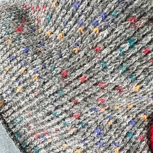 Gray knit with red, orange, blue and teal "arrows" in the design.