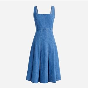 Stylish denim midi dress. Features a square neckline. Perfect for casual outings.
