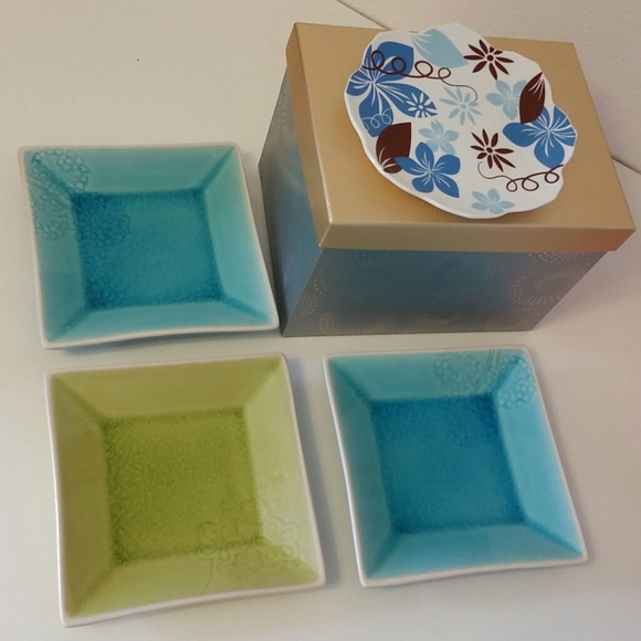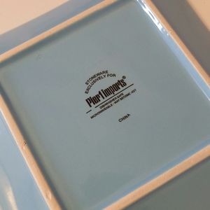 Pier 1 desert / candy plates 6" x 6" stoneware ceramic. Dishwasher safe and microwavable. Shiny cracked design in green and blue. One plate is white porcelain with brown and blue flower design. All new, never used in perfect condition.