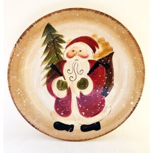 Holiday plate featuring Santa Clause. This is a 8.5" diameter plate for salad, buffet, or would make a nice cookie plate. The hand painted, hand crafted plate has Santa Clause with his bag over his shoulder and a green evergreen tree in the background. There are white dots that make it look like it is snowing. Nice plate for any holiday table or buffet.
