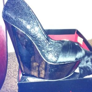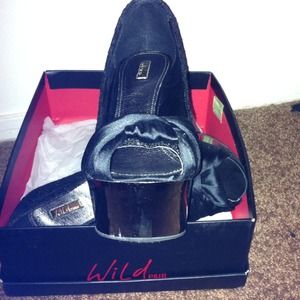 HOTNESS!!!!!! Black, flower design on top of sequince, satin bow on top of toes, silver mirror wedge. Barely worn, 6 and a half inches in height. Made by wild pair