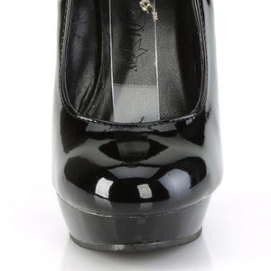 6" High Heel, 1" Platform High Heel Shoes. Adjustalble Ankle Strap. Vegan Friendly Black Faux Patent Leather.