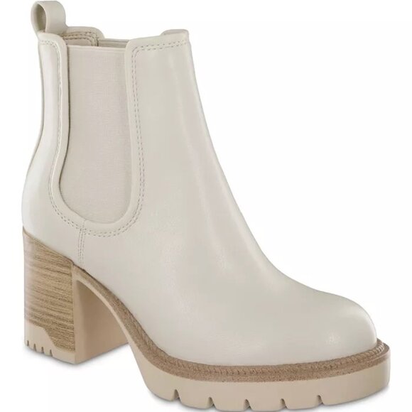 Comfortable and stylish! Ivory leather bootie with platform heel. Runs true to size.