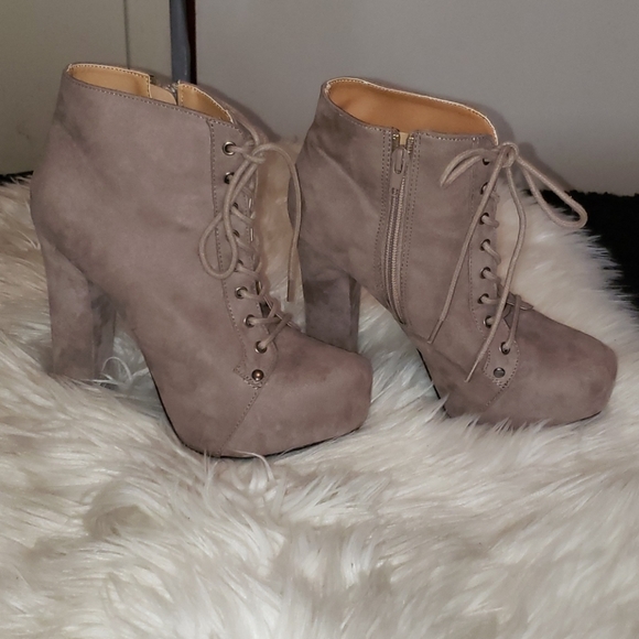 All new without box ~never worn~ Chunky heel 5" Side zipper Front tie Almond toe Faux suede Taupe color Ankle boots