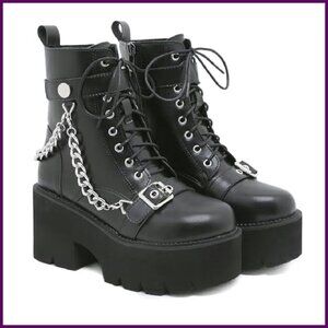 These statement boots combine edgy style with wearable comfort, featuring a versatile lace-up, zip, and buckle closure system. The chunky platform and metal chain details create a bold, gothic look perfect for making an impact.