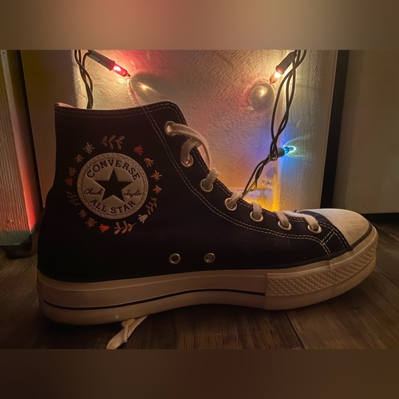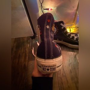 these are platform converse i got but they are way to big.. they are a little dirty and on one of them there are like dirt marks that can be washed off.. but i am accepting offers so lmk!! they have such cute designs on the and i would so wear them if they fit!