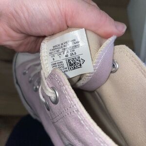 Only worn a couple times. A few scuffs but nothing a magic eraser couldn’t fix. Super cute light pink/purple color. Size 9 in women’s