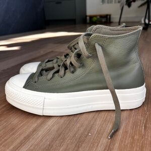 Super cute pair of high top platform, Converse, green leather shoes, women’s size 8. Worn once