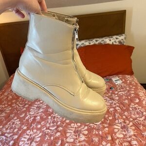 Platform cream boots from Forever 21. Size 8-ish. They have the cutest functional zipper detail. These were well loved so there are some scuffs as show in picture. I will clean before sending if these sell.