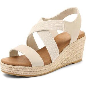 wedge sandals, espadrille shoes, open toe sandals, crisscross straps, slip-on shoes, summer wedges, women's beige shoes, size 10 sandals, cushioned footbed, elastic straps, platform shoes, casual footwear, comfortable sandals