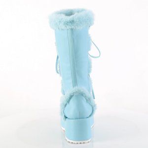 2 3/4" Platform Faux Fur Trim Lace Up Boots. Mid Calf Height. Full Inner Side Zipper Closure. Baby Blue Faux Leather.