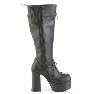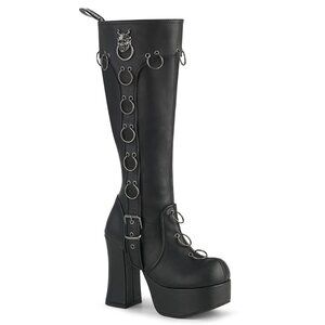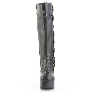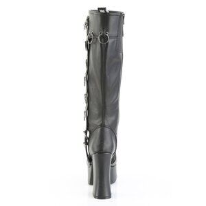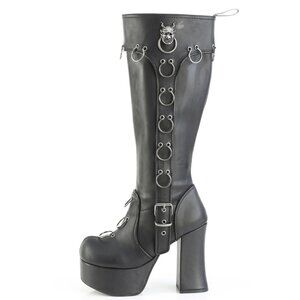 4 1/2" Block Heel, 2" Platform Gothic Knee High Boots. Pierced O-Ring Upper. Ornamental Buckle Detail with Metal Devil Bullhorn. Inner Side Zipper Closure. Faux Leather.