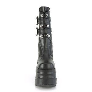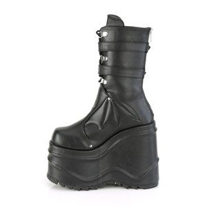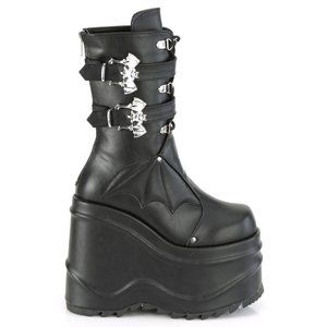 6" Wedge Platform Gothic Lace Up Boots. Mid Calf Height and Quilted Bat Wings Design on Vamp. 2 Bat Buckle Ankle Straps. Back Metal Zipper Closure. Black Faux Leather.