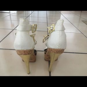 White upper leather platform shoes with gold heels and blue and white stones on the strap coming down the front of the shoe. Worn once. Couple scrapes on the heel.