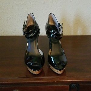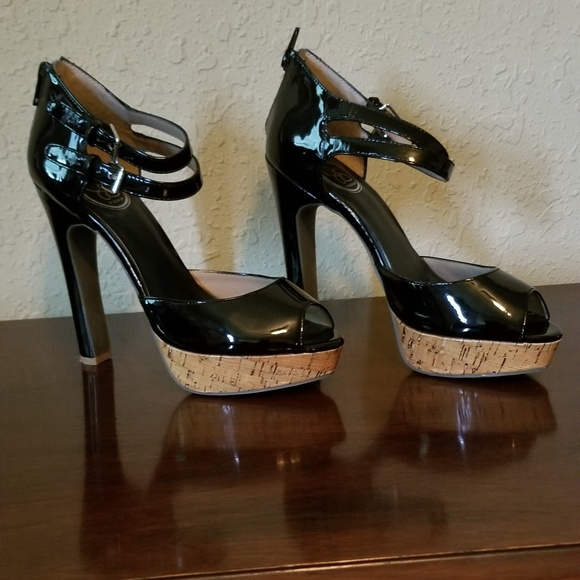 This black patent leather heel is in excellent condition. No flaws of any kind. It's an open toe sandal with double straps across the ankle. The platform is a cork pattern. The pictures don't do it justice. These are super cute. Perfect addition to your shoe wardrobe! The platform is 1 1/4 in and the heel is 5 inches