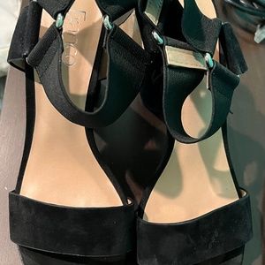 Black suede platform heels, elastic strap, size 8.5 by Franco Sarto, used once