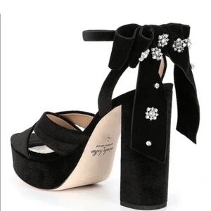 Beautiful black with rhinestones and pearl detailing, pre-tied bow back, platform heel with ankle strap. Beautifully elegant high heels