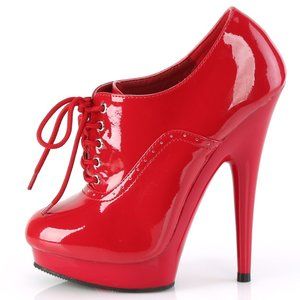 6" High Heel, 1" Platform Lace Up Ankle Boots. Red Faux Patent Leather.