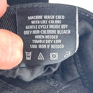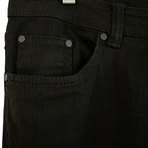 Solid black denim jeans with black hardware detailing & buttons. Zipper fly with Button Closure- This Black Button has Brand Logo inscribed in white, belt loops, 5 pockets, natural rips at knees.
