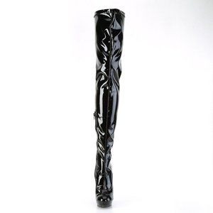 6" High Heel, 1" Platform Crotch Thigh High Boots.1/2 Length Inner Side Zipper Closure. Black Stretch Faux Patent Leather.