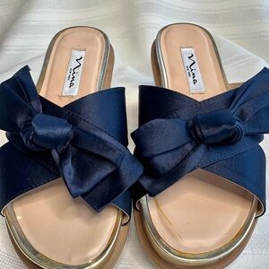 Platform Sandal Flip Flop Nina Navy Satin Gold Sz 5 EUC