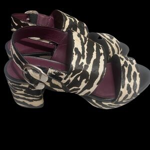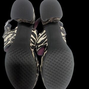 Zebra print platform sandals with block heel, size 10, 3 inch heel with 1.5 inch platform. New, never worn. Right shoe has slight color imperfection on top.