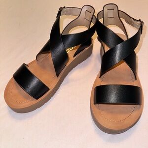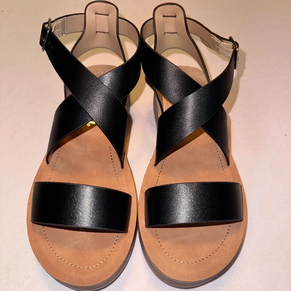 Never been worn. Size 6.5. They feature a comfortable platform sole and criss-cross adjustable straps for a secure fit. They are perfect for everyday wear.