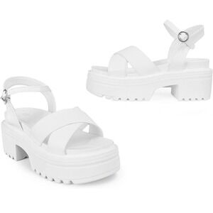 NWT from ReadySalted (sold on Amazon) comes these throwback 90s/ early 2000s white platform sandals. These are in polar white color. They are open toed with a criss cross strap across the toes and a strap with buckle around the ankle. Straps made from synthetic leather. Heel height is 2.36 in exactly. Great reviews online