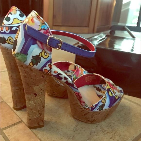 Gorgeous floral platform heels, Height 4 1/2, Blue ankle strap Size 9. New