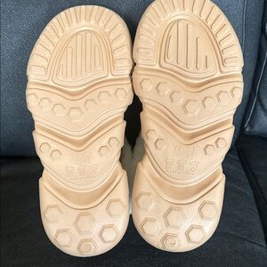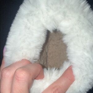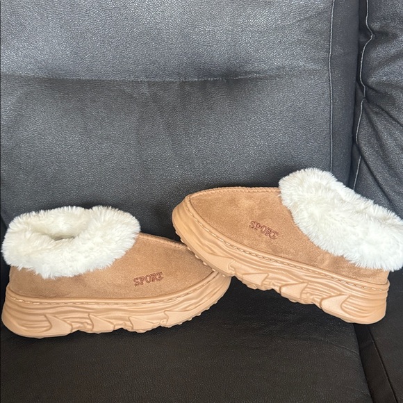 Cozy tan slippers with faux fur lining. Perfect for comfort and warmth. Great condition