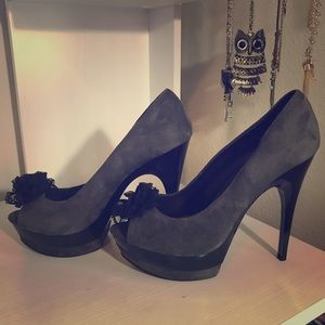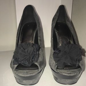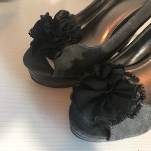Has a sued finish. Peep toe with a lace flower shaped bow on top . Very comfortable to walk in.