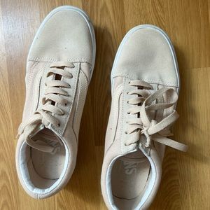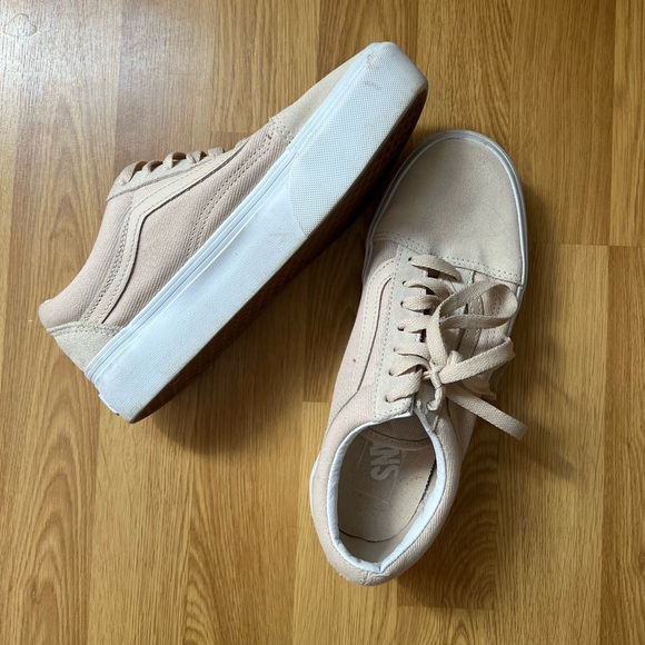 Platform Vans in a cream color. Worn only a handful of times. The markings on the white gum could easily be cleaned with a Magic Eraser. Perfect summer sneakers! Cross posted