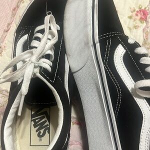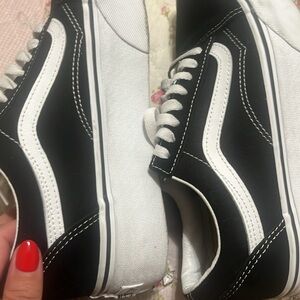 Stylish Vans platform shoes. Classic black and white design. Comfortable and trendy.