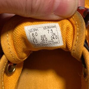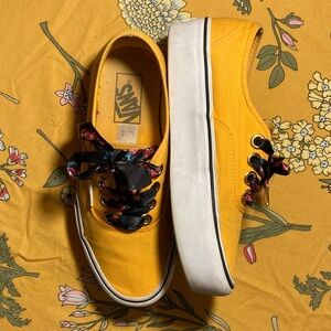 Sunflower yellow Vans with silky floral laces and gold accents. Platforms.