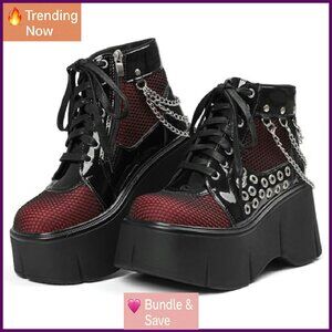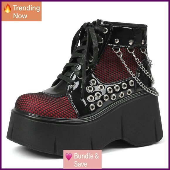 • Style: Combines a lace-up combat silhouette with goth-inspired mesh and chain details, a round closed toe, and a chunky platform sole.