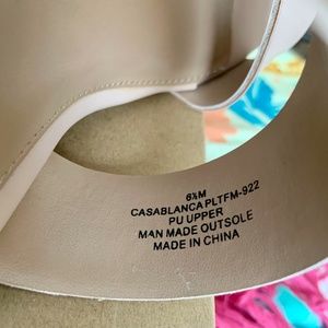BNIB cork wedge strappy sandal, color is "nude". PU upper (not real leather). Super cute just never reach for them and I have way too many shoes. 😂 1 1/2" to 3 1/2" graduated wedge. Brand is Rohb by Joyce Azria.