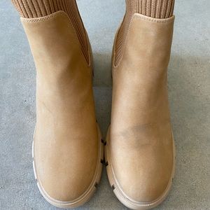 Cutest booties, bought and they are too small. Size 5.5. There is a scuff on left boot, I did not try to clean it but will come out with cleaning. Suede khaki. Cutest boots ever! Worn once.