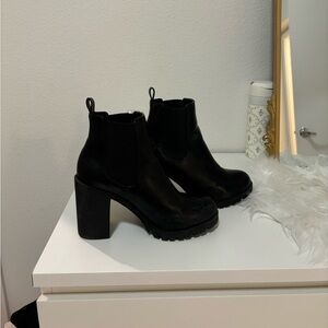 Soda size 8 heeled boots. Heel is about 3-4 inches. Comfy! Only worn a handful of times and haven’t been worn in four years