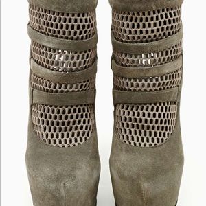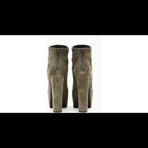 Elly Clay olive platform booties. Suede leather. 2.5” platform 6” high chunky tall heel.