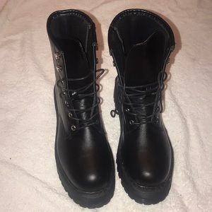 90s style platform boots. Can be paired with cargos with chain for a rock n roll feel or can be worn under baggy pants. These are a size 6 but feel way bigger and look huge on my feet. I recommend getting a size smaller if you want to style these. Never worn.
