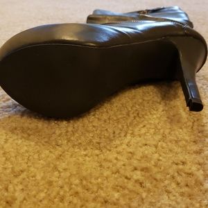 New in box. Size 6. Never worn. Leather with zipper accent. Pull on. 4 inch heel. 2 inch platform. Minor scuff on right boot